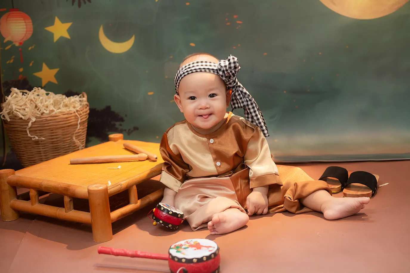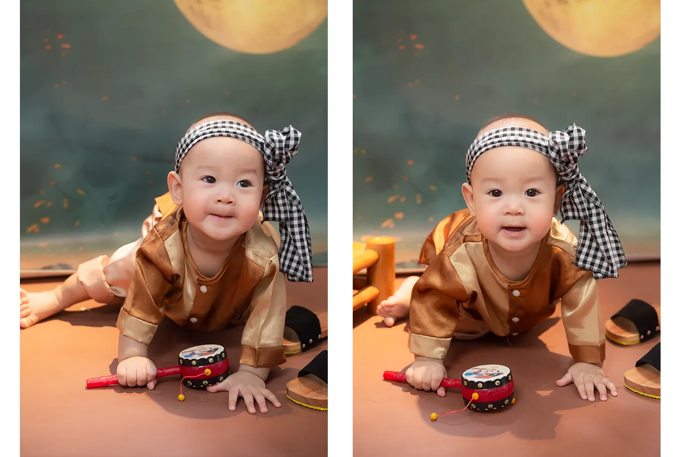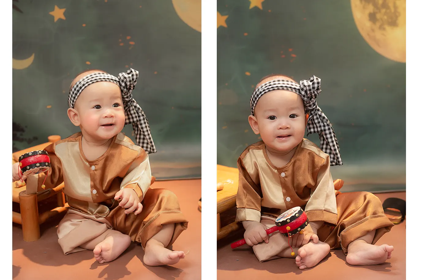 Concept lần này mang cảm hứng từ hình ảnh Chú Cuội bên gốc đa dưới ánh trăng rằm, bé Gấu hóa thân thành một Cuội nhí hồn nhiên, đáng yêu với nụ cười trong veo. 🌙✨