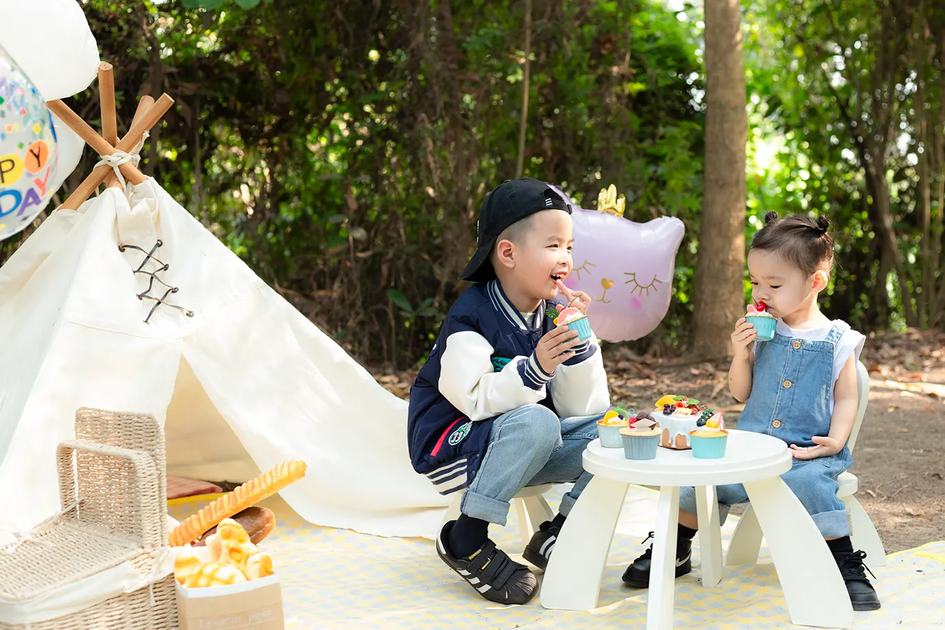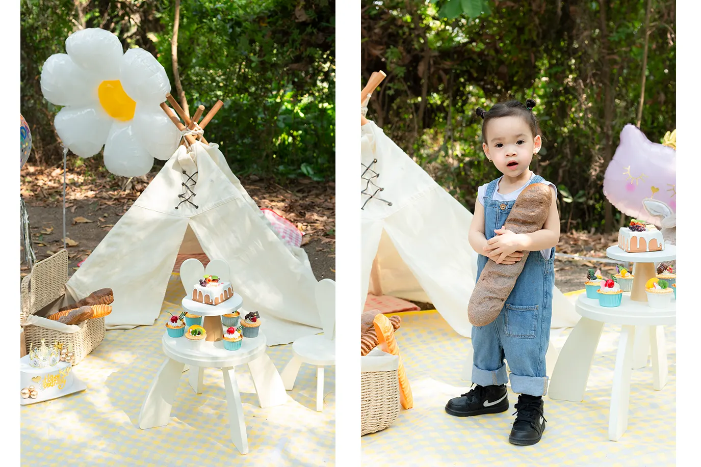 Cả nhà ơi, hôm nay con có một chuyến đi dã ngoại cực kì “cute”. Nào là lều, nào là bong bóng, bành mì và bánh kem. Tất cả đều bày biện trước mặt con, khiến con phát thèm luôn à.