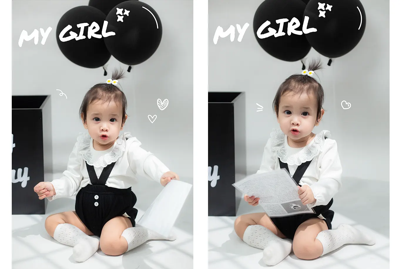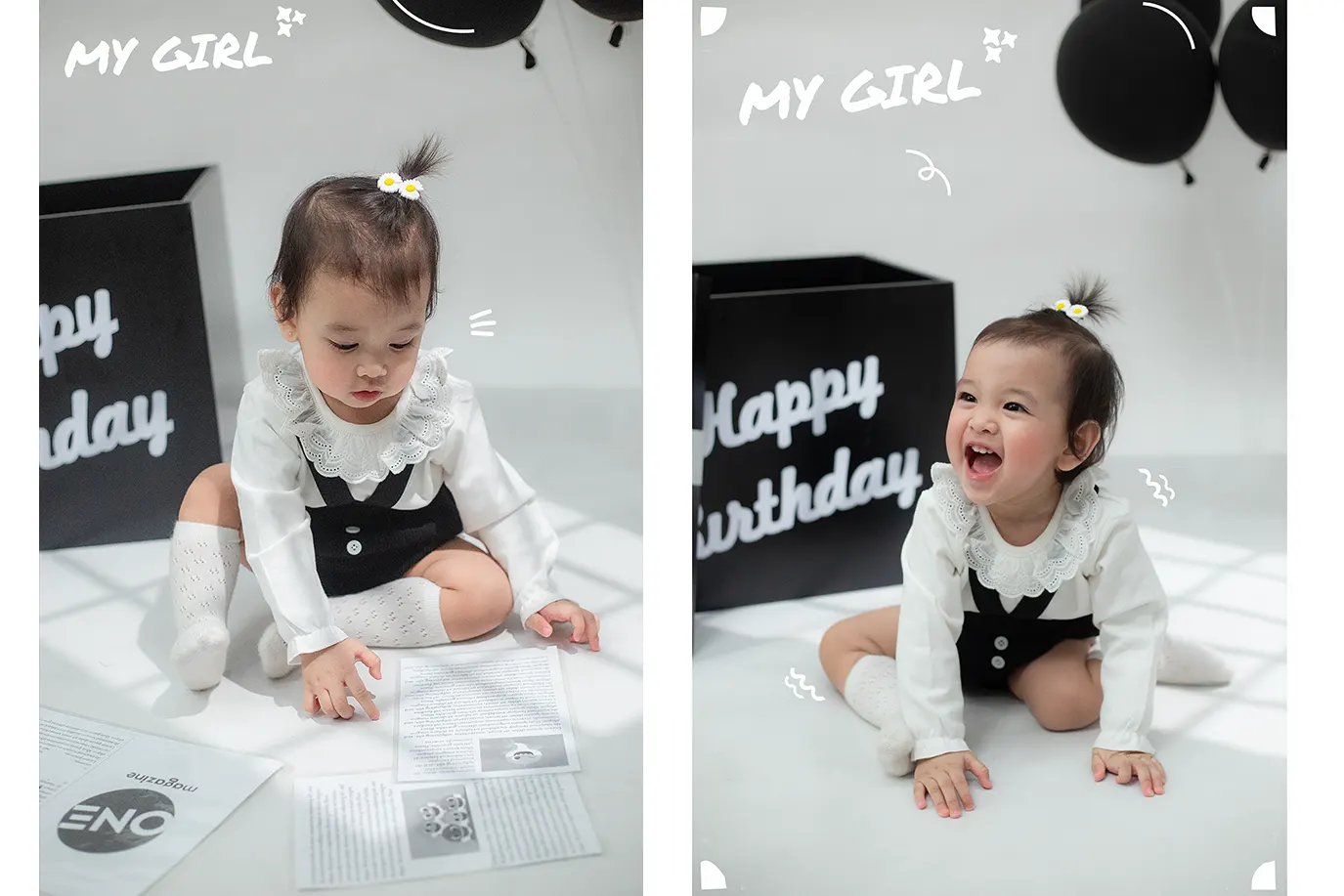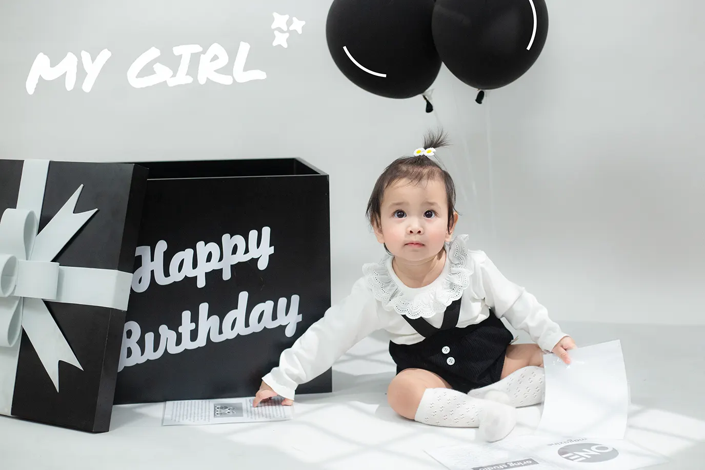 Trên nền phông trắng tối giản, điểm xuyết những vệt nắng đổ nhẹ nhàng (fake sunlight) tạo nên một không gian vừa nghệ thuật vừa hiện đại. Tâm điểm của khung hình chính là cô bé Vanie rạng rỡ bên cạnh hộp quà sinh nhật màu đen huyền bí và những chùm bóng bay tone-sur-tone cực “ngầu”.