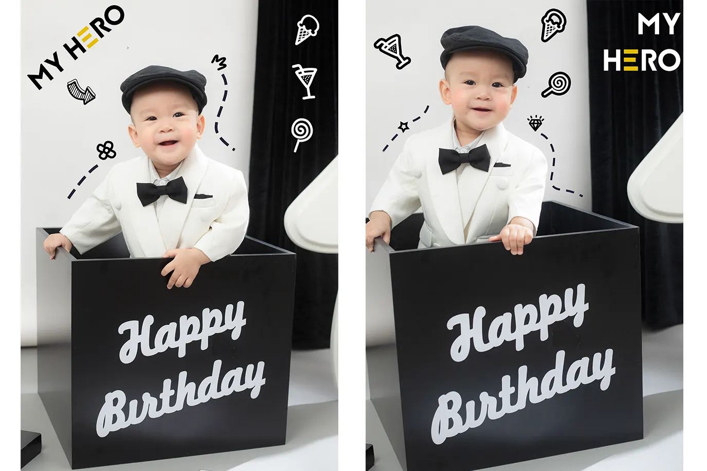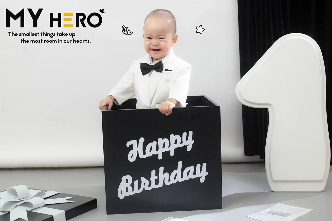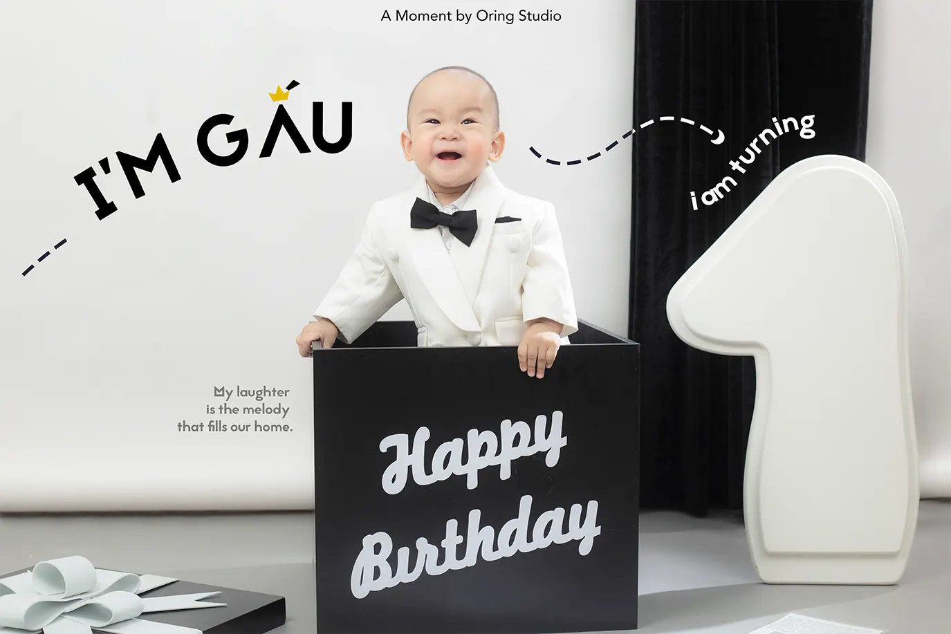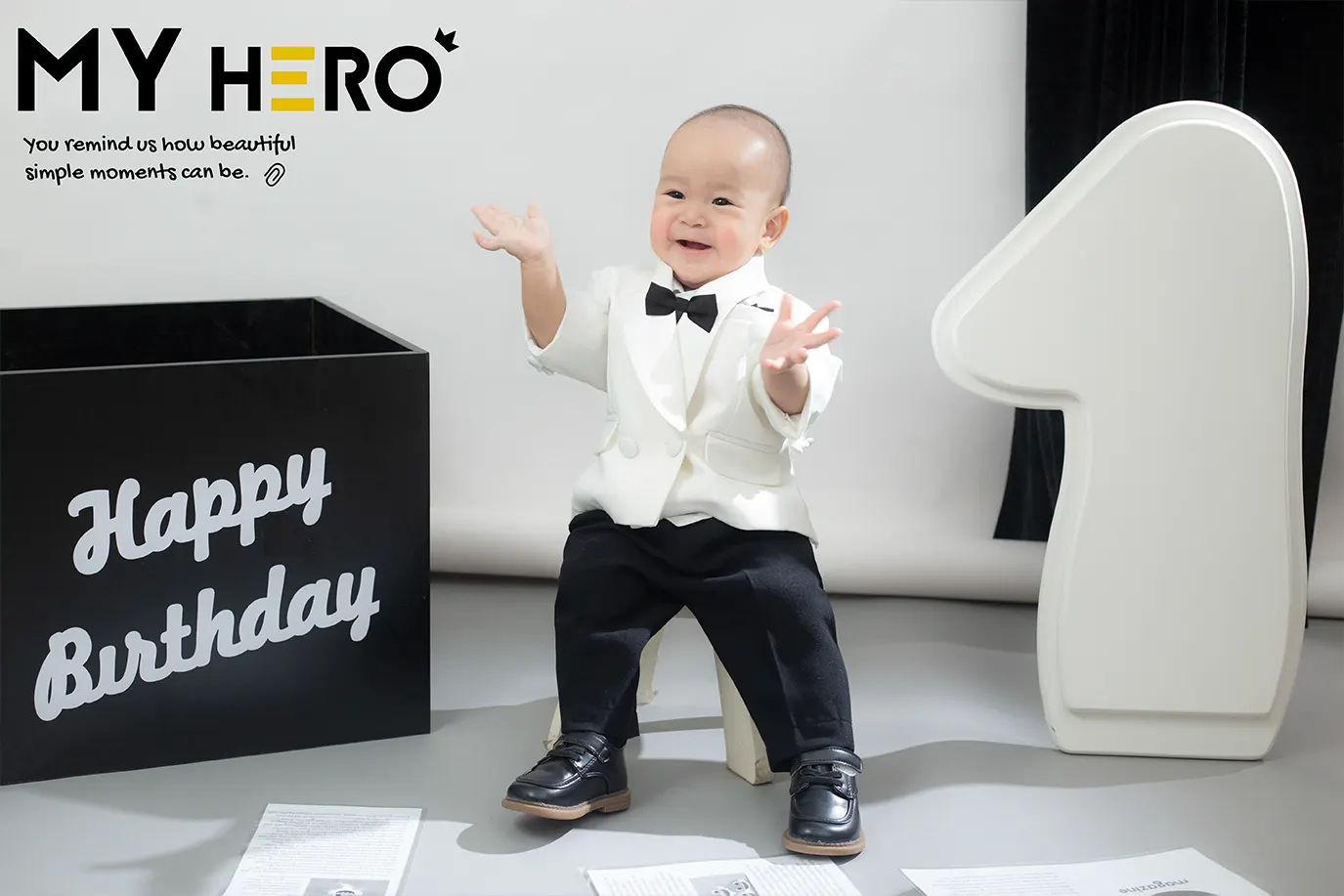 Tạm biệt những gam màu rực rỡ, bộ ảnh lần này lựa chọn phong cách Black & White tối giản cùng concept Tuxedo Trắng Thanh Lịch, mang đến một vẻ ngoài trưởng thành cho các bé 1 tuổi.