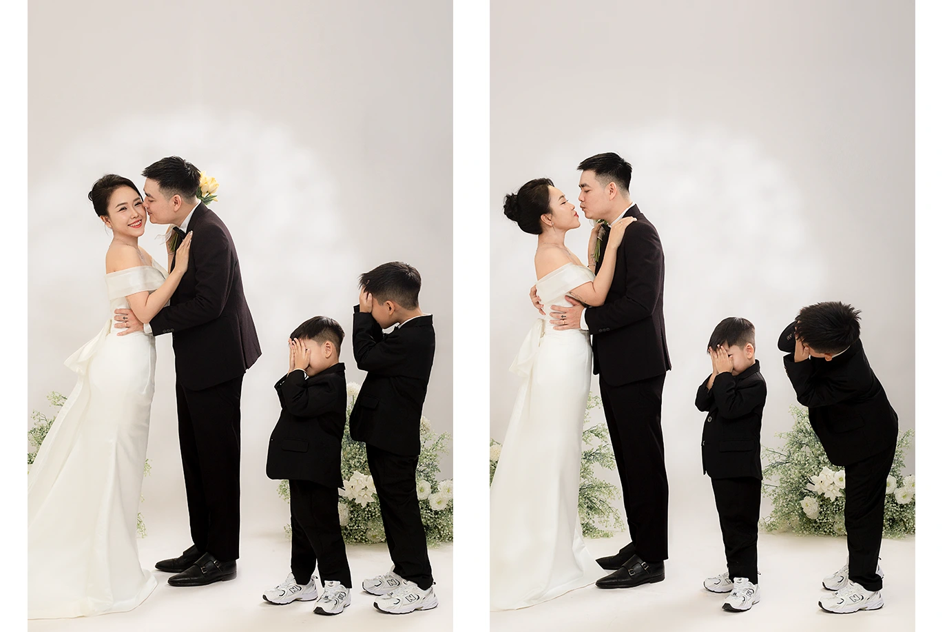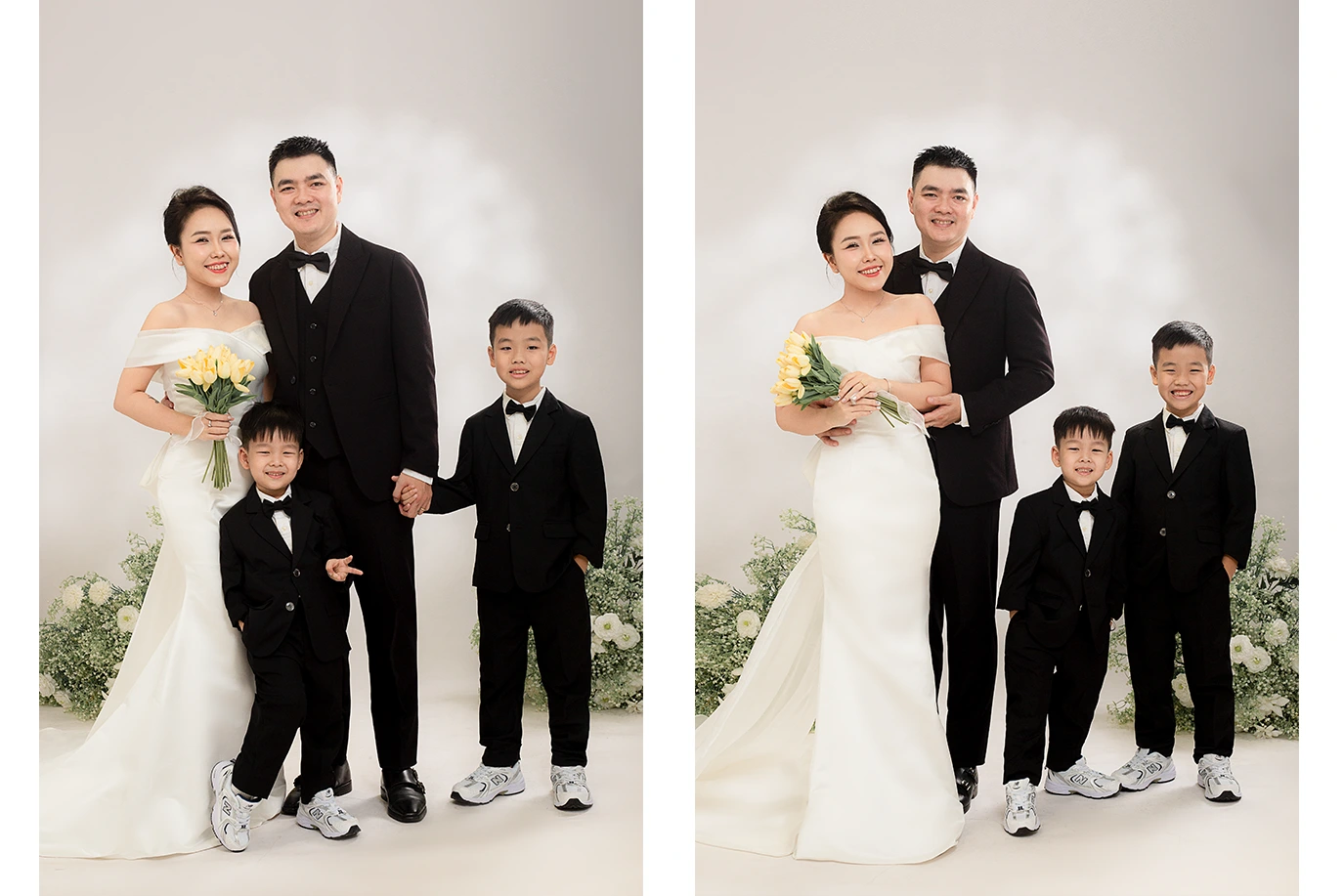 Trong bộ ảnh này, ba mẹ diện lại đồ cưới, còn hai nhóc tì thì đáng yêu hết nấc. Mỗi bức ảnh đều chứa đựng những khoảnh khắc ấm áp, tình cảm mà chắc chắn sẽ khiến bạn “tan chảy”.
